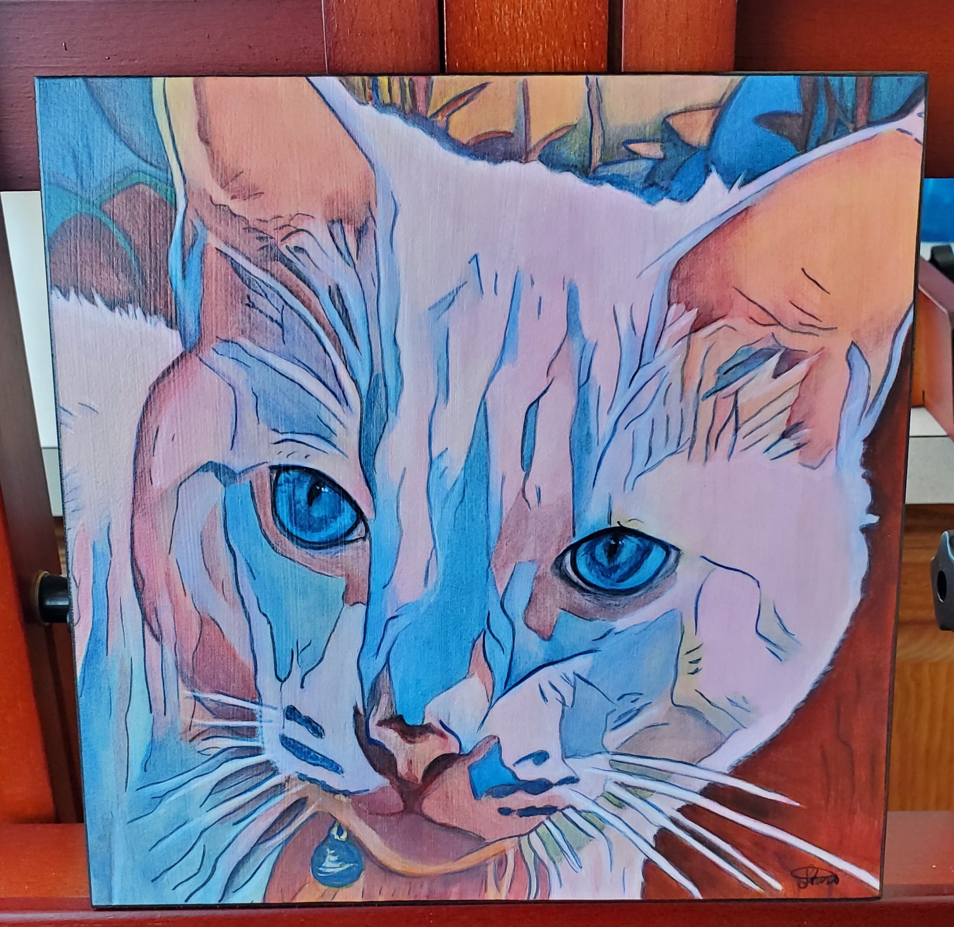 On the sixth day, God created all the land animals. Today, celebrate the creation of our beloved pets with a unique, custom pet portrait! Your pet will be depicted in the vibrant Abstract Realism style on a professional wood panel, using wood stain and India ink. The artwork is sealed with Polycrylic for a durable, lasting finish.